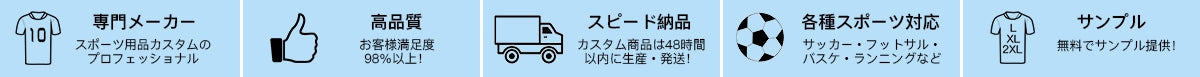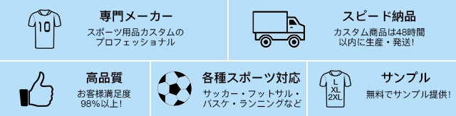 これまで全世界100,000チームにサービスを提供。 最高品質の素材を用い、納得の価格でご提供。 コストパフォーマンスは最高。 5万円以上のご注文で更に送料無料!